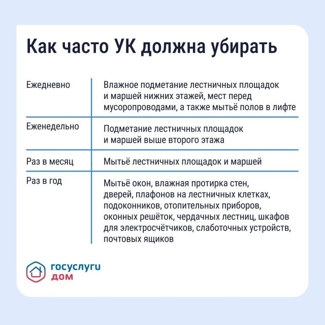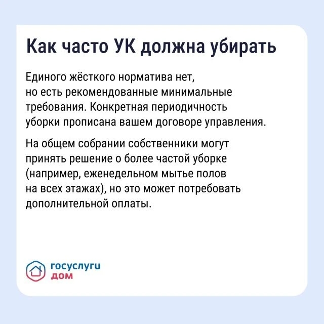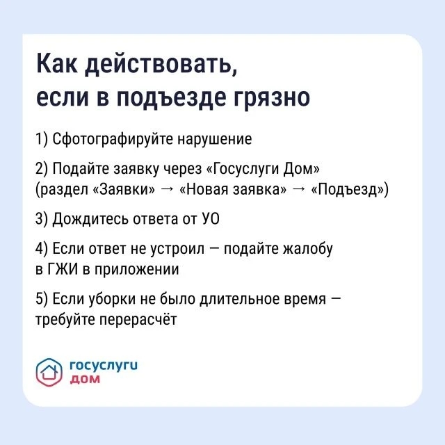 Как навести порядок в подъезде Грязные полы, пыльные перила, забитый мусоропровод — это прямое нарушение прав жильцов. Поддерживать чистоту в местах общего пользования обязана управляющая организация (УО). Рассказываем, какие рекомендации по уборке существуют и как повлиять на УО через приложение «Госуслуги Дом». Скачать «Госуслуги Дом» и навести порядок в подъезде: vk.cc/cR4yLN.