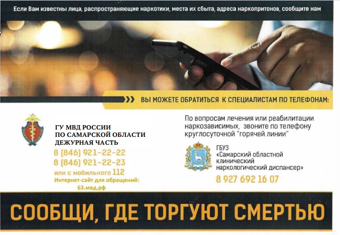 Информацию о преступлениях и правонарушениях в сфере незаконного оборота наркотиков можно сообщить по круглосуточным телефонам дежурной части ГУ МВД России по Самарской области 8 (846) 921-22-22, 8 (846) 921-22-23, в дежурные части территориальных органов внутренних дел или по многоканальному телефону 102, а также на официальный интернет-сайт: https://63.мвд.рф через сервис «прием обращений».