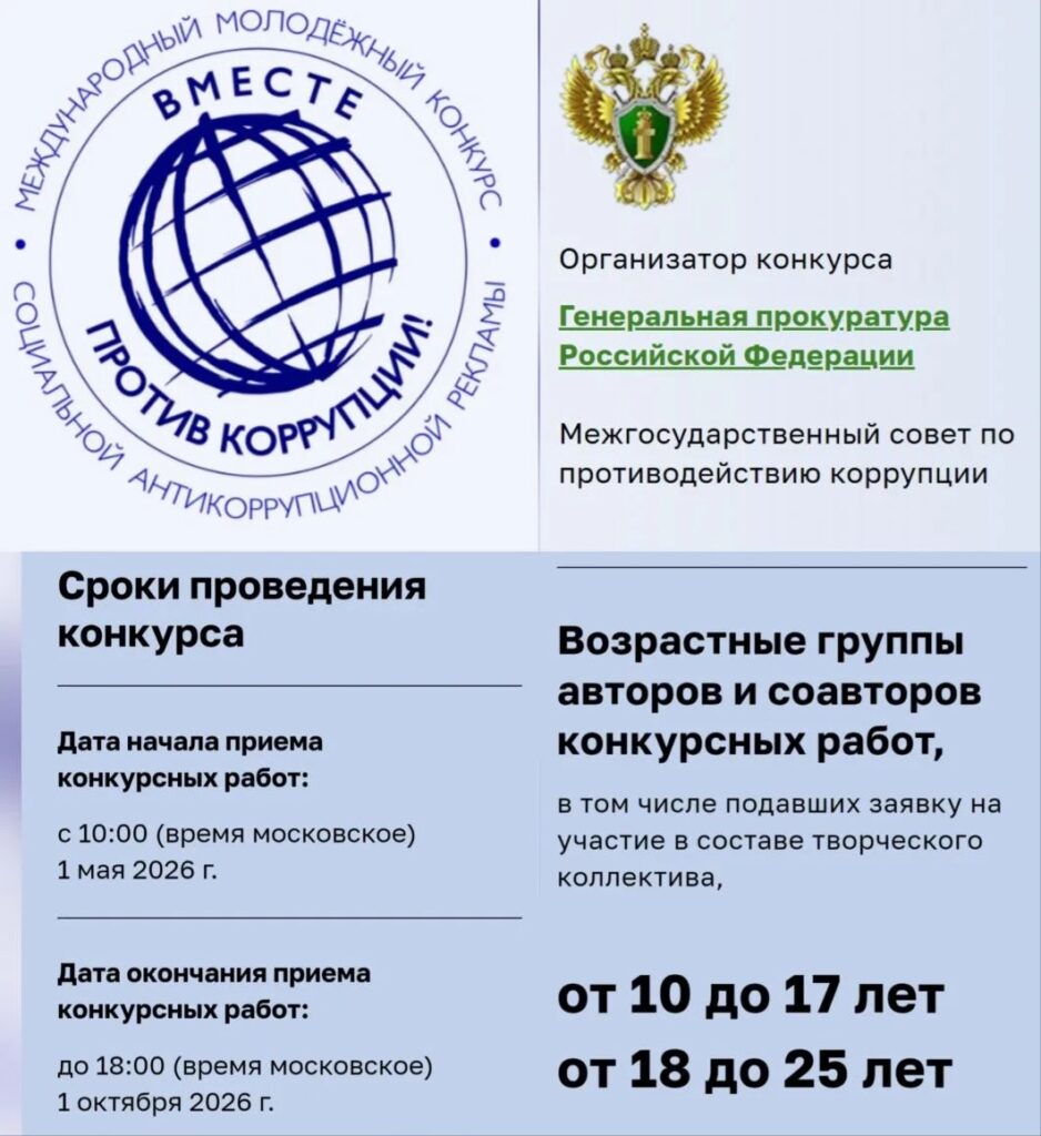По поручению Генерального прокурора Российской Федерации в 2026 году проводится Международный молодёжный конкурс социальной антикоррупционной рекламы «Вместе против коррупции!».